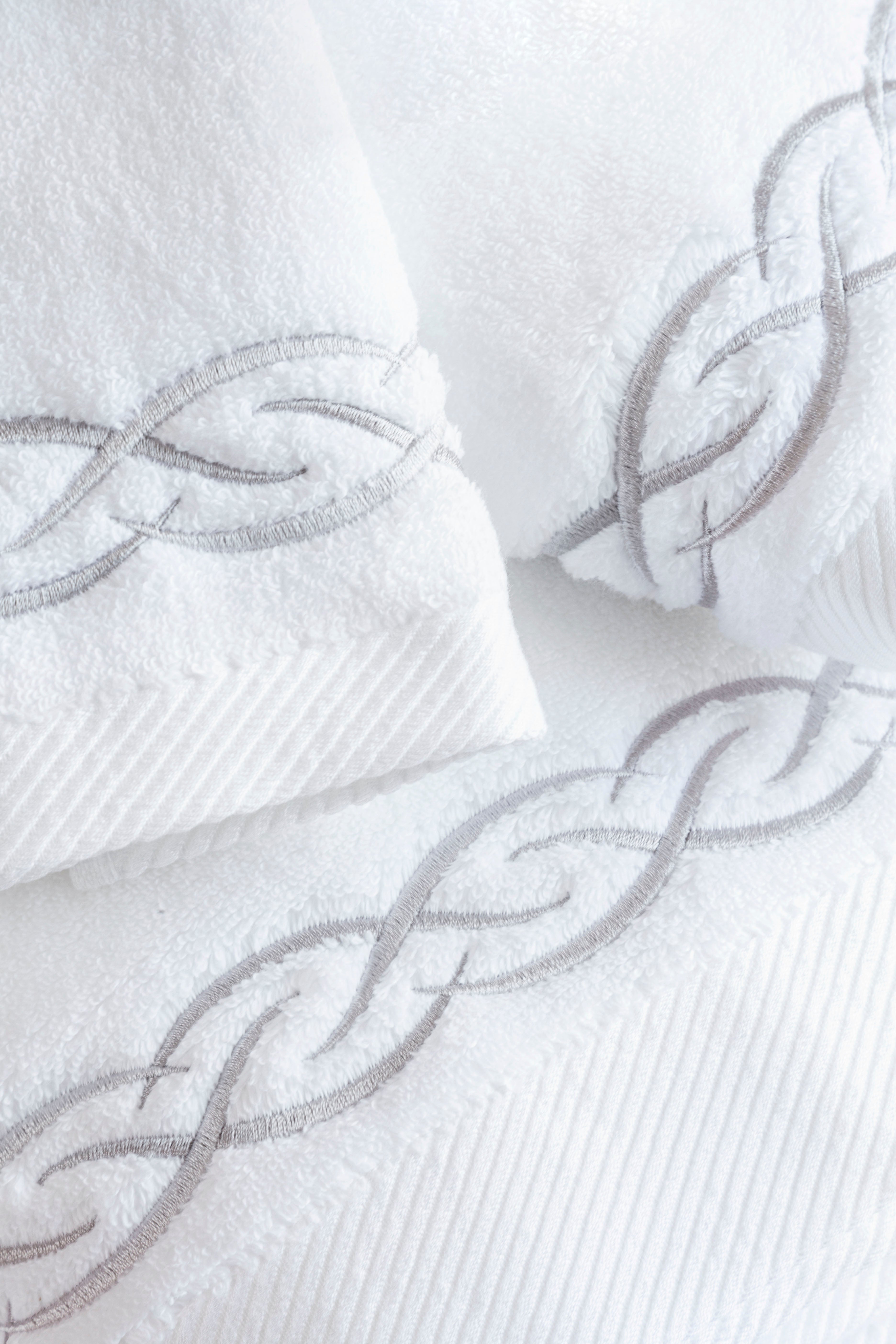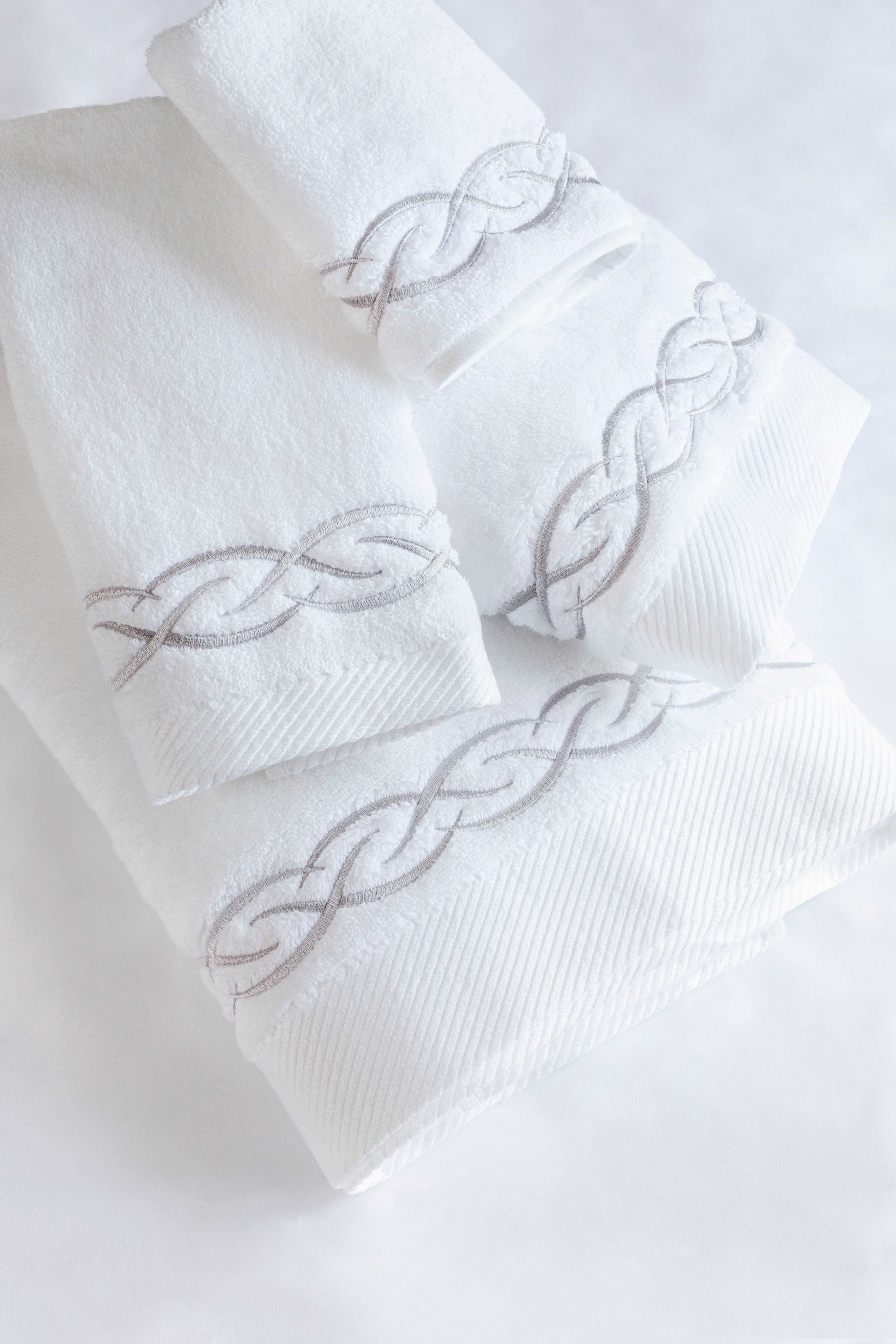 A modern interlocking motif embroidered in soft metallic tones elevates this plush white terry design. The Geometric bath towel brings contemporary elegance and refined structure to your bathroom.