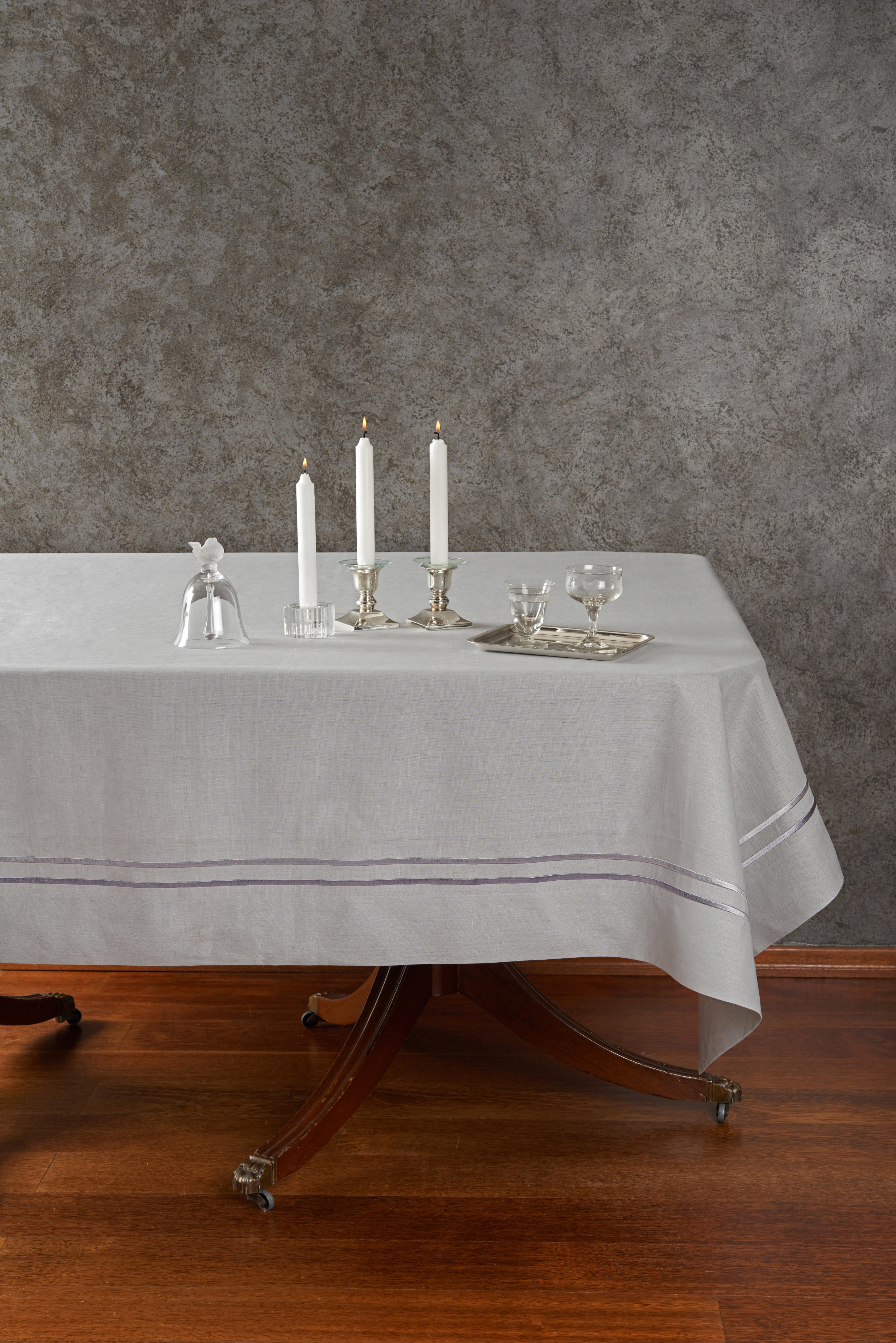 Subtle sophistication defines the Double Lines tablecloth, where two refined parallel borders in lustrous thread accentuate the crisp purity of fine linen. This understated design exudes quiet luxury, complementing both modern and traditional table settings with timeless elegance.